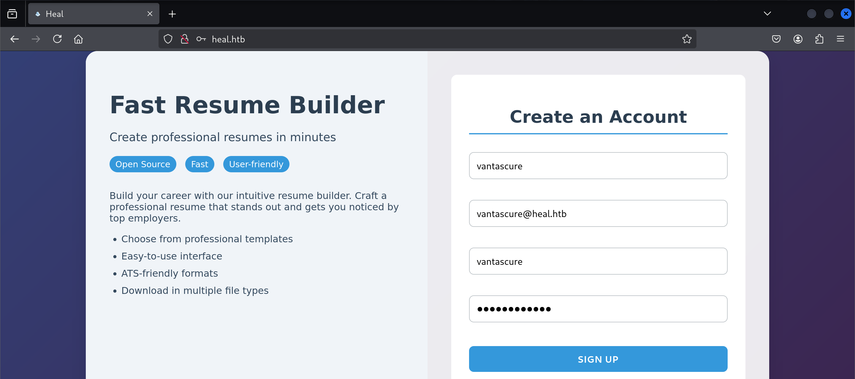 I then navigated to heal.htb, which appears to be a resume builder. I then signed up for an account.