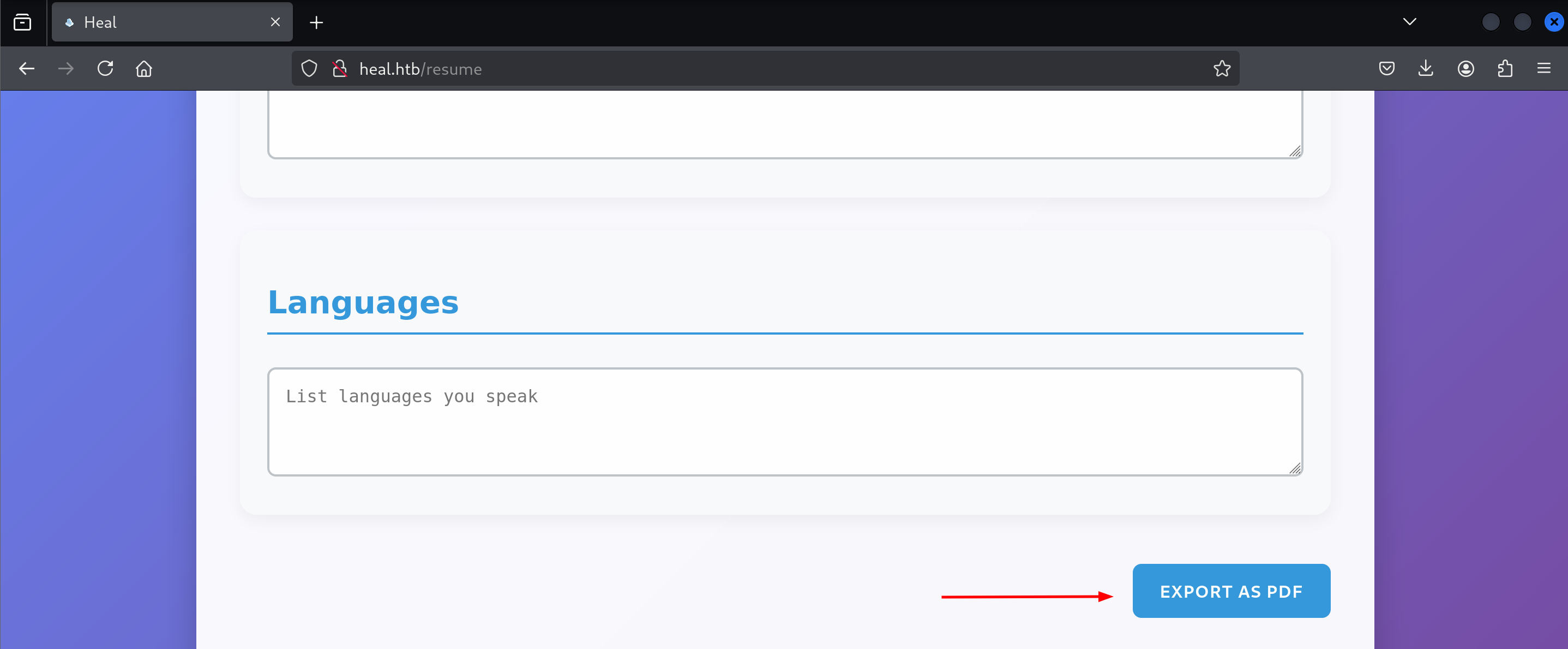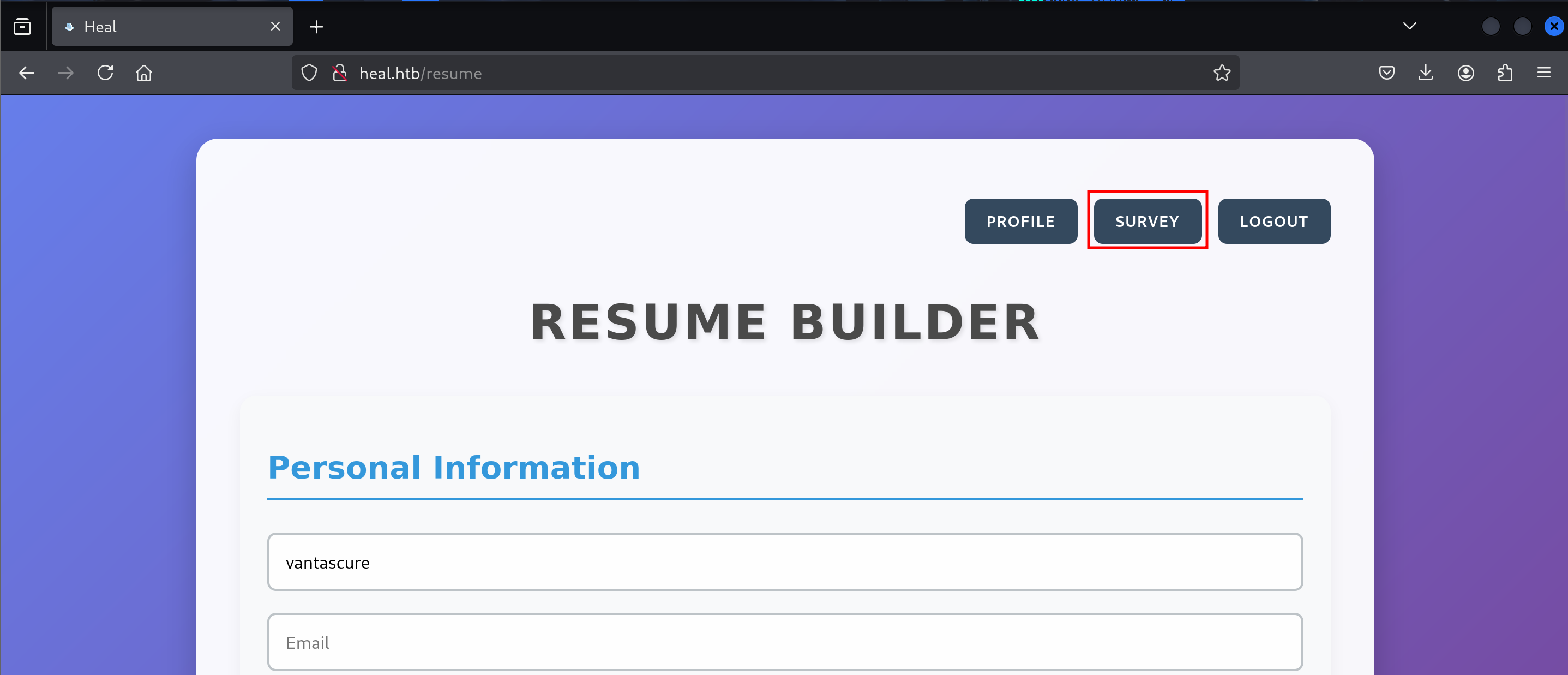 When navigating to the take-survey.heal.htb subdomain, it told me that ralph is an administrator. I made note of this and returned to the resume builder.