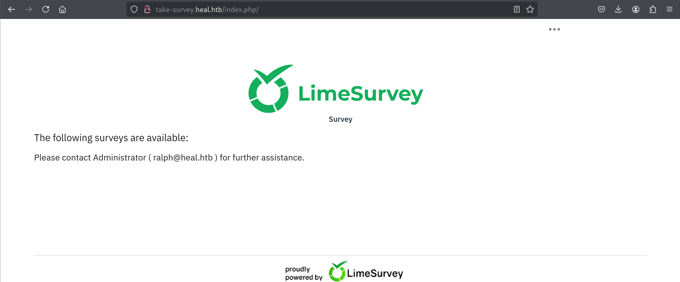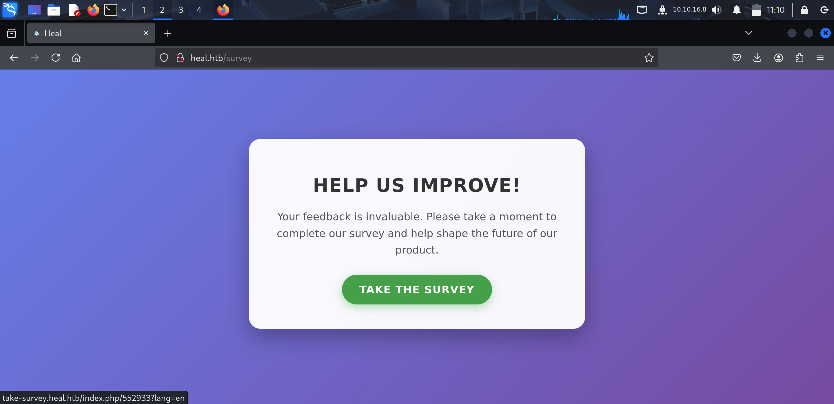 On the Survey page, I found that if I clicked the “Take The Survey” button, it would direct me to the take-survey.heal.htb subdomain.