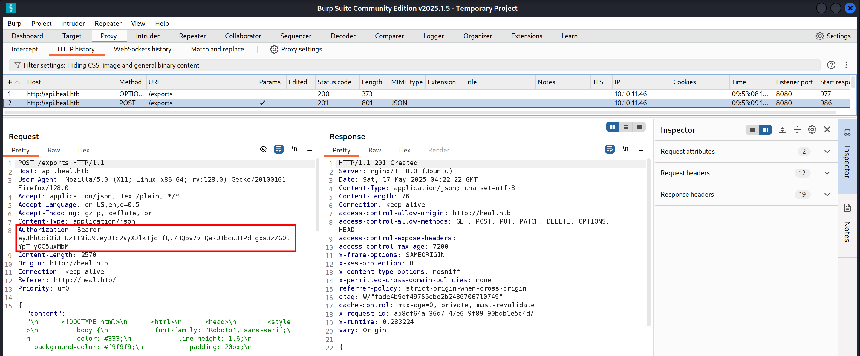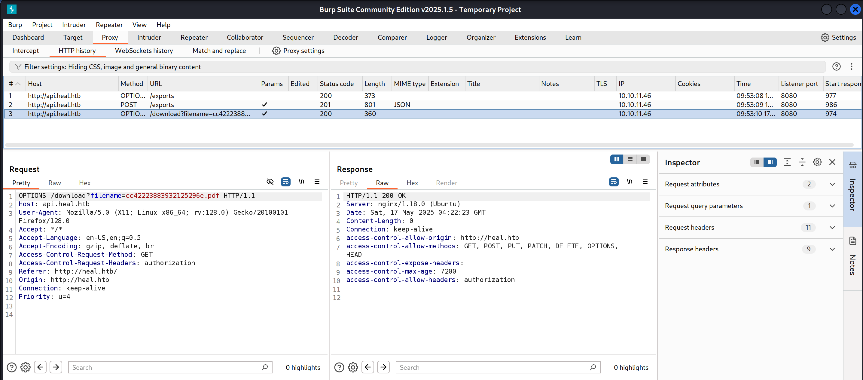 I then carried out vhost fuzzing and found the vhost api.heal.htb.